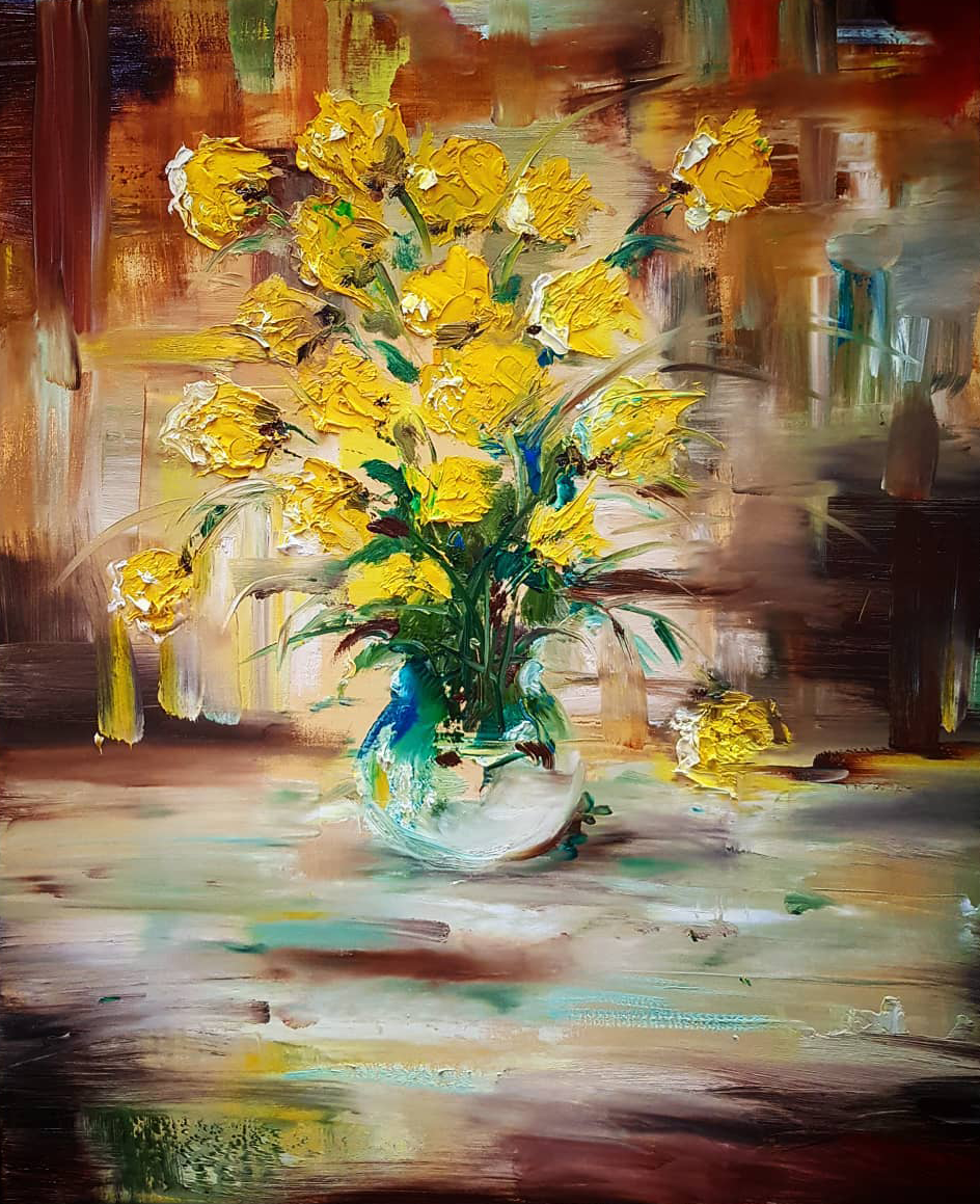 Olja är det medium jag målat längst i, jag målar främst med vattenlöslig olja av högsta kvalitet. Genom att arbeta med denna olja behöver jag inte jobba med skadliga förtunningar. Oljan tillför ett unikt djup och struktur i mina verk.